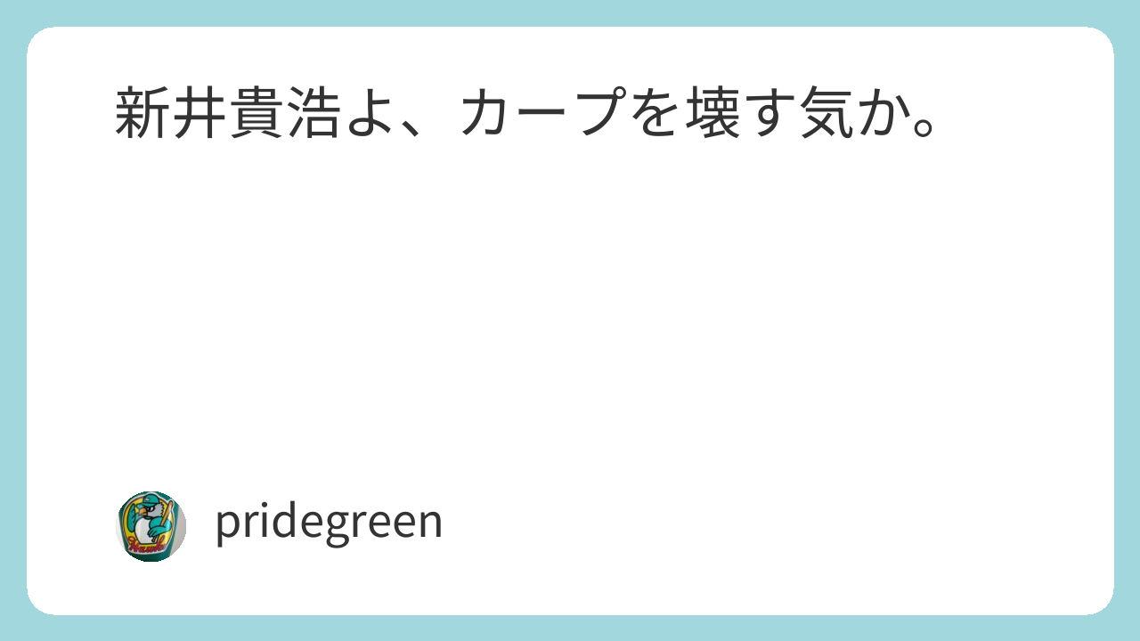 はっきり言う。新井はカープファンの敵だ。新井のせいでカープは向こう数十年ぺんぺん草も生えない荒れ野となってしまうだろう。いや、これは正確ではない。新井は所詮ハジメの操り人形であるというべきだ。さすがは「諸国民の王」である。あるいはボナパルティズムを体現しているといえばいいか。ちびの伍長と違って図体だけはでかいが。