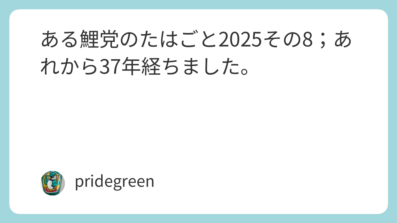 もう、「10.19」といってもなんのこっちゃと感ずる向きが多くなったに違いないが、もちろん近鉄バファローズの戦いが初めて全国区になったといっていい日である。それについては、もう嫌ほど書いたから、繰り返さない。むしろ付け加… 続きを読む ある鯉党のたはごと2025その8;あれから37年経ちました。