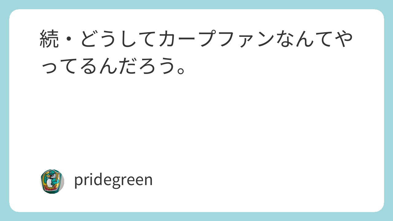 どうも先日来、自らのIdentity崩壊の危機に悩んでいる。はっきり言ってなんで自分がカープなるものを推しているのかについて自己嫌悪にも近いものを持っているのだ。それは自分の過去と生き様に対する自己否定に他ならないし、自… 続きを読む 続・どうしてカープファンなんてやってるんだろう。