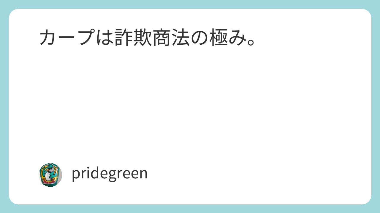 言わずもがなだが、「羊頭狗肉」という言葉がある。羊の頭を掲げて犬の肉を売るという意味で、見てくれは立派だが中身は伴っていないことを意味する故事成語だ。原典は中国は宋の時代の書物のようだが、古代から詐欺商法はまかり通ってき… 続きを読む カープは詐欺商法の極み。
